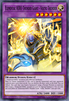 2 Monstros "Elemental HERO" com atributos diferentes.Deve ser Fusion Summon. Se esta carta for Special Summon e seu oponente controlar mais cartas do que você: você pode destruir todas as outras cartas no campo. Você pode tributar esta carta que foi Fusion Summon usando um Monstro Normal como material e, depois, escolha 1 monstro "Elemental HERO" no seu cemitério; Special Summon o alvo. Você só pode usar cada efeito de "Elemental HERO Thunder Giant - Voltic Thunder" uma vez por turno.