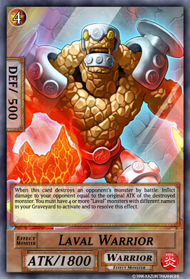 Quando essa carta for destruído em batalha e enviado para o cemitério: você pode enviar 2 monstros \"Laval\" do seu deck para o cemitério.
