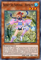 Você pode banir 2 monstros "Six Samurai" do seu cemitério e/ou virados para cima do seu campo e, em seguida, escolher 1 monstro "Six Samurai" no seu cemitério, exceto "Secret Six Samurai - Hatsume"; Special Summon o alvo. Você só pode usar este efeito de "Secret Six Samurai - Hatsume" uma vez por turno. Se exatamente 1 monstro "Six Samurai" que você controla (e nenhuma outra carta) seria destruído por um efeito de carta, você pode banir esta carta do seu cemitério em vez disso.